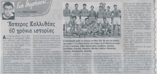 Στην εφημερίδα (φύλλο 20ης Δεκεμβρίου 2003), με τίτλο “Έσπερος Καλλιθέας: 60 χρόνια ιστορίας”, δημοσιεύτηκε το παρακάτω άρθρο του Πάνου Γεραμάνη: